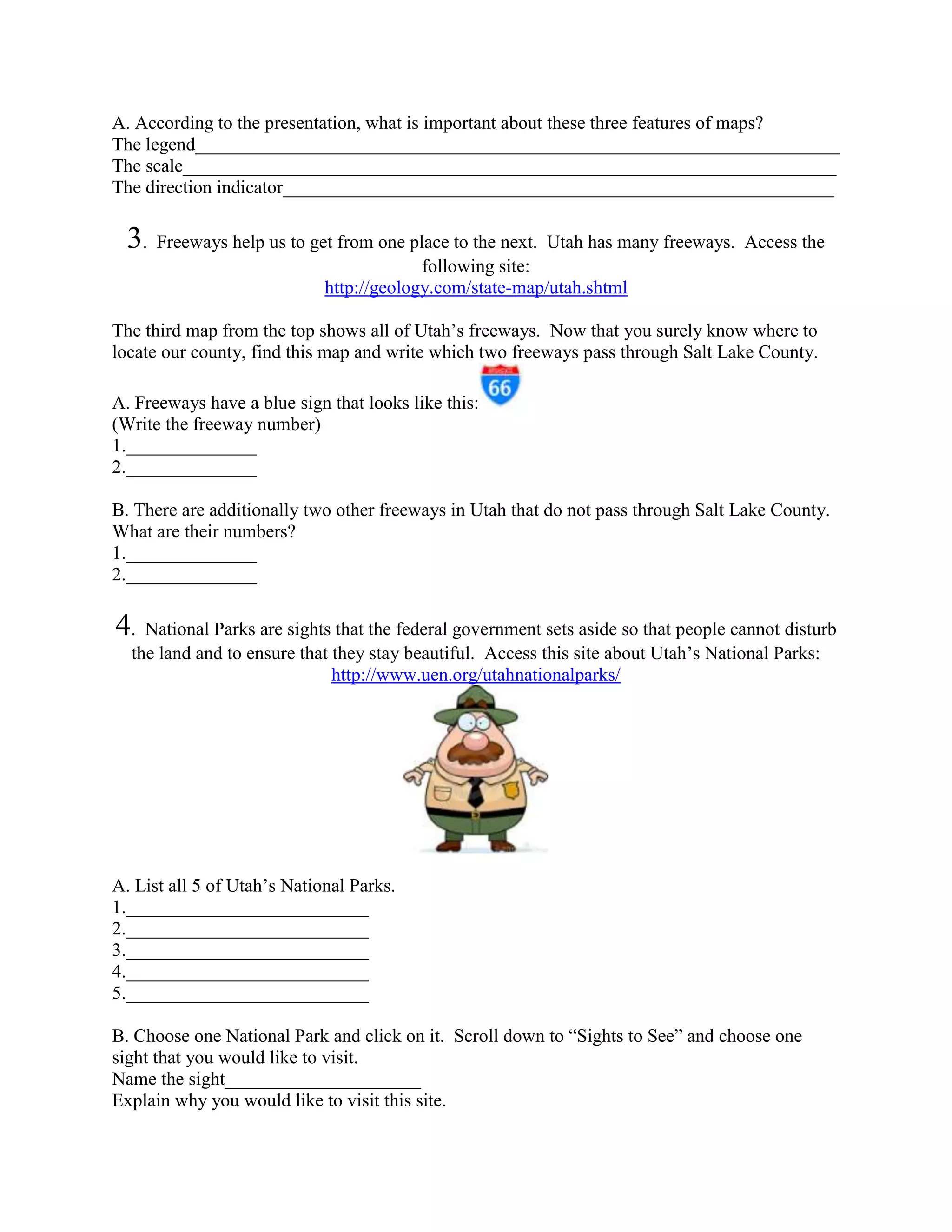 This document provides a guide for students to learn about the geography and history of Utah through an online webquest. It includes questions about Utah's counties, national parks, American Indian tribes, landmarks, and population. Students are asked to explore maps, videos, and websites to learn about Utah's geographic features such as mountains and the Great Salt Lake, as well as historic events like the joining of the transcontinental railroad. The goal is for students to gain a better understanding of their home state.