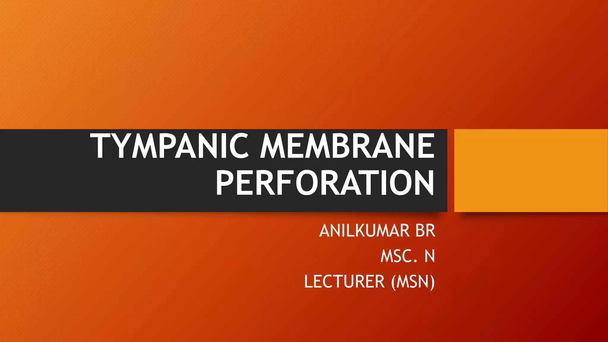 This document discusses tympanic membrane perforation, also known as a ruptured eardrum. It can be caused by direct force trauma to the ear such as from wax removal or skull fractures, or indirect force from barotrauma or increased violence/firearms. Infection of the middle ear from bacteria, viruses or fungi can also cause a perforation. Symptoms include ear pain, fullness, discharge from the ear, hearing loss, vertigo, and tinnitus. Diagnosis involves history, physical exam, otoscopic exam, and audiogram. Treatment involves antibiotics to prevent infection, keeping the ear canal clean, avoiding nose blowing or ear drops, and surgery if not healed after 3 months. S