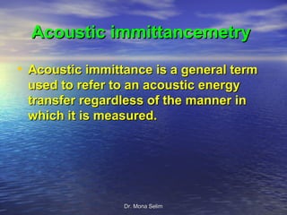 This document discusses acoustic immittance testing, specifically tympanometry. It begins by defining key terms like acoustic immittance, impedance, and admittance. It then describes the process of tympanometry testing including instrumentation, measurement of static compliance, and interpretation of results. Common tympanogram shapes are classified according to systems like Jerger-Liden and Feldman. The document also notes factors that can affect tympanometry and limitations of the test. In summary, tympanometry is a quick, non-invasive test that assesses middle ear function by measuring acoustic immittance at varying ear canal pressures.