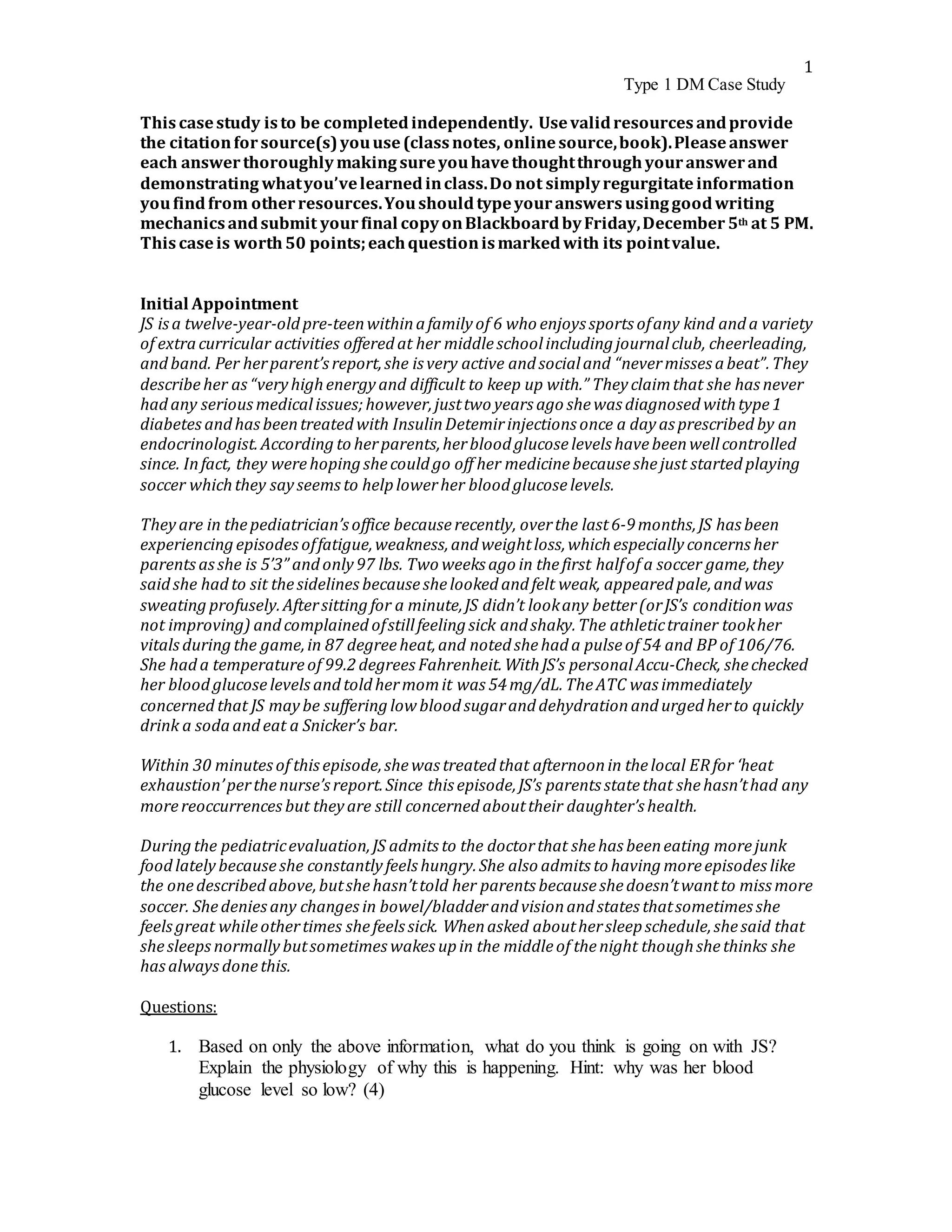 JS, a 12-year old girl with type 1 diabetes, has been experiencing episodes of fatigue, weakness, and weight loss. During a soccer game, she felt sick and her blood glucose level was found to be low. She was treated for heat exhaustion. The doctor thinks she may be experiencing diabetic ketoacidosis. Proper management of type 1 diabetes requires lifelong insulin administration, monitoring of blood glucose and ketone levels, and maintenance of a healthy diet and activity levels to prevent dangerous fluctuations.