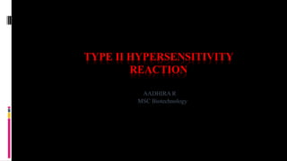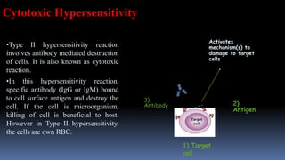 Type II hypersensitivity reactions involve antibody-mediated destruction of cells through three main mechanisms: complement-mediated cell lysis, antibody-dependent cell-mediated cytotoxicity (ADCC), and target cell dysfunction. Complement-mediated lysis results from membrane attack complex formation following complement activation by antigen-antibody complexes. ADCC occurs when antibodies bind to cell surfaces and recruit natural killer cells to induce apoptosis. Target cell dysfunction involves antibodies altering cell surface receptors and physiology rather than directly killing cells, as seen in Graves' disease and myasthenia gravis. Examples provided include autoimmune hemolytic anemia, hemolytic disease of the newborn, Goodpasture syndrome, and drug-induced thrombocytopenia.