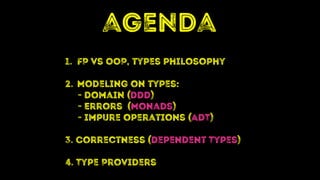 The document discusses the differences between object-oriented programming (OOP) and functional programming (FP), emphasizing the shift in thinking from behavior-focused to data-type focused. It illustrates various concepts using F# types for email verification, shopping cart management, and error handling, highlighting the importance of managing side effects in functional programming. Additionally, it provides examples of how to implement functional programming principles in practical scenarios.