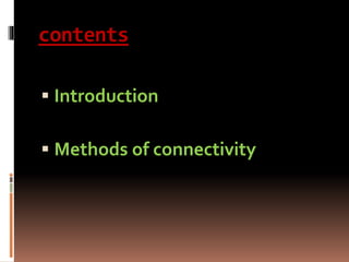 This document discusses different types of internet connectivity. It describes gateway access, dial-up connection, leased connection, DSL, cable modem connection, and VSAT. Gateway access provides limited internet access through a local network. Dial-up uses modems to connect over phone lines. Leased connections offer dedicated, high-speed access. DSL and cable modems utilize existing phone and cable infrastructure. VSAT uses small satellite terminals for connectivity.