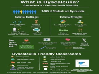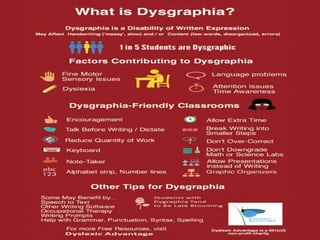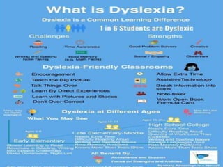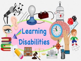 This document discusses learning disabilities, including that they are neurological disorders caused by differences in brain wiring that make it difficult for children to perform tasks like reading, writing, spelling, reasoning and recall, despite their intelligence being average or above average. It outlines laws like IDEA that require public schools to provide special education and IEPs to disabled students. Specific learning disabilities are also defined, like dyslexia, dysgraphia and dyscalculia. Famous historical figures who achieved success despite having learning disabilities are cited as examples.
