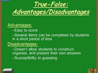 This document discusses different types of test items including multiple choice, true/false, and classification items. Multiple choice items can have one right answer, best answer, worst answer, or be analogy based. True/false items include basic true/false questions as well as modified versions like three response, correction, cluster, and alternative answer items. Classification items require identifying an unrelated word or phrase from a group.