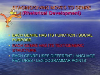 The document discusses different genres of writing and provides examples of each. It covers the genres of narrative, recount, news item, description, and report. For each genre, it describes the social purpose, generic structure, and common language features. Examples are also provided to illustrate the generic structure of a narrative, recount, and news item.