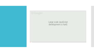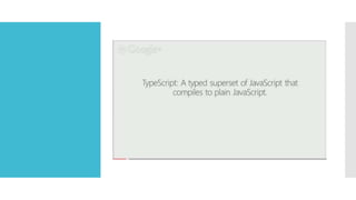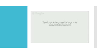 TypeScript is a superset of JavaScript that adds static typing and classes to address the problem of writing large applications in JavaScript. It allows for intelligent IDE features like autocompletion and refactoring by adding types that are removed during compilation, ultimately producing plain JavaScript code. TypeScript aims to make large scale JavaScript development easier with types and tooling while still targeting the JavaScript that browsers understand.