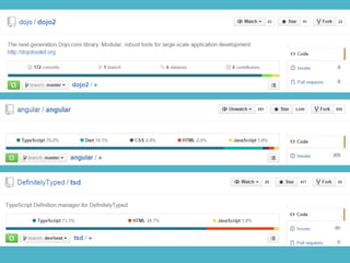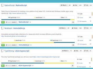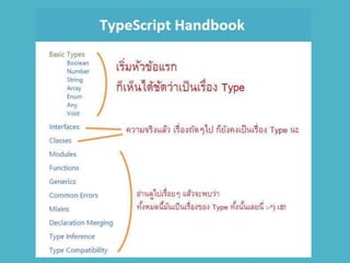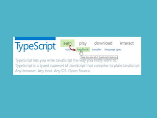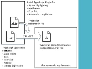 This document provides an overview of TypeScript, a superset of JavaScript that adds static typing features. It covers basic types, type inference, and functionality such as generics and lambda expressions. Additionally, it includes resources for further development with TypeScript and its integration with frameworks like AngularJS.