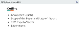 The document presents a study on generating type representations from text using a Type-to-Vector (t2v) approach, facilitated through distributional semantics and embeddings. It evaluates the properties of t2v, focusing on its ability to support analogical reasoning and measure similarity and relatedness between types. The findings indicate that t2v closely aligns with semantic meaning and can assist in ontology matching tasks.