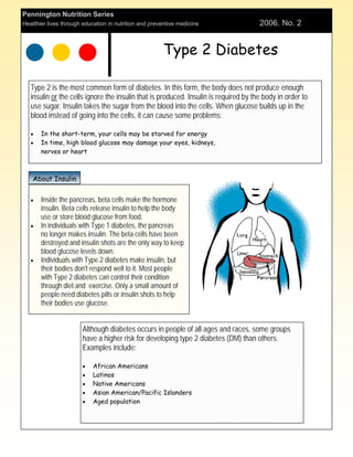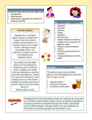Type 2 diabetes occurs when the body does not produce enough insulin or ignores the insulin produced. Left untreated, high blood glucose can damage organs. The document summarizes diabetes complications like hypoglycemia and hyperglycemia, their causes and treatments. It emphasizes the importance of monitoring blood glucose levels to control diabetes and prevent related health issues.
