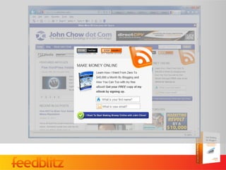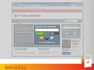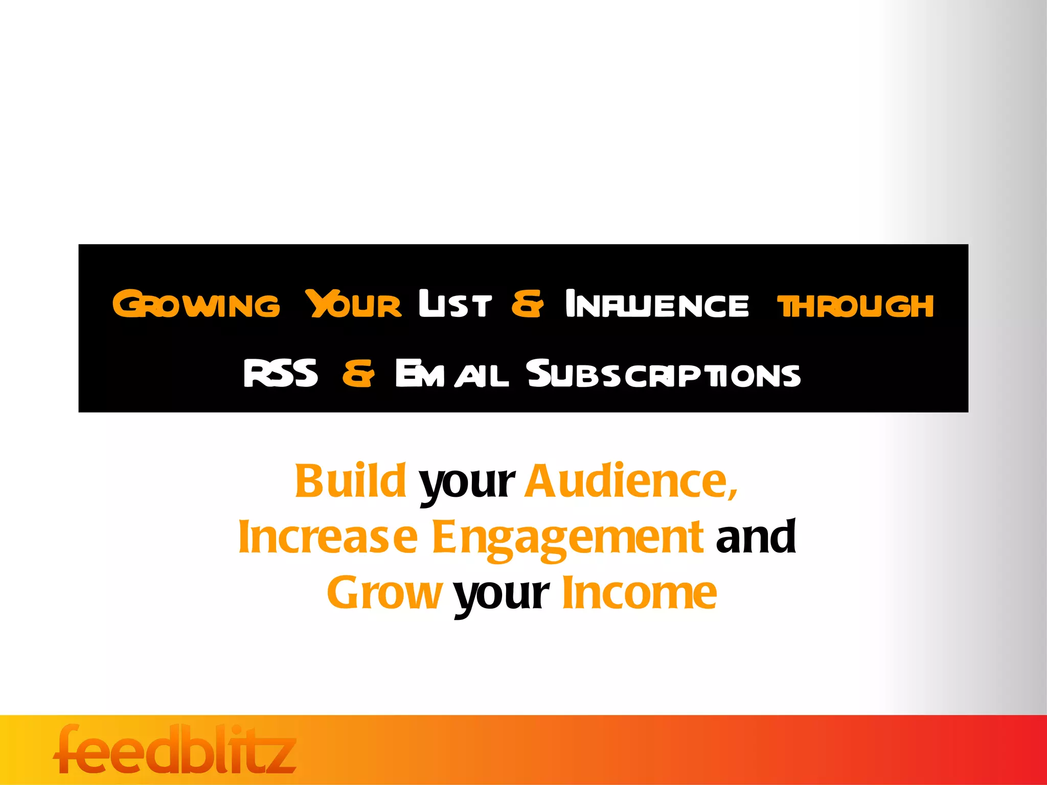 This document provides tips for bloggers to grow their email list and increase engagement through email subscriptions and RSS feeds. It discusses the differences between email and RSS subscriptions and why email is still a powerful option. It then gives 10 power tips for building a list, such as making the subscription form visible, enabling social media cross-promotion, adding incentives, and using compelling copywriting. The document also covers improving engagement, growing lists through offline events, diversifying with multiple lists, and avoiding spam. The overall message is that a strong email list is important for content marketers and bloggers.