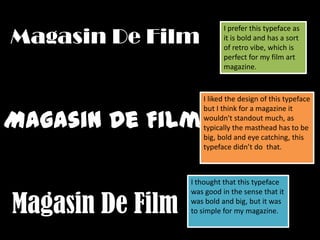 This document discusses a typeface being considered for a film art magazine masthead. While the typeface has a retro vibe, bold style, and is simple, it is deemed too simple and wouldn't stand out enough as a magazine masthead needs to be big, bold, and eye-catching to capture attention. A different, more attention-grabbing typeface would be better suited for the magazine.