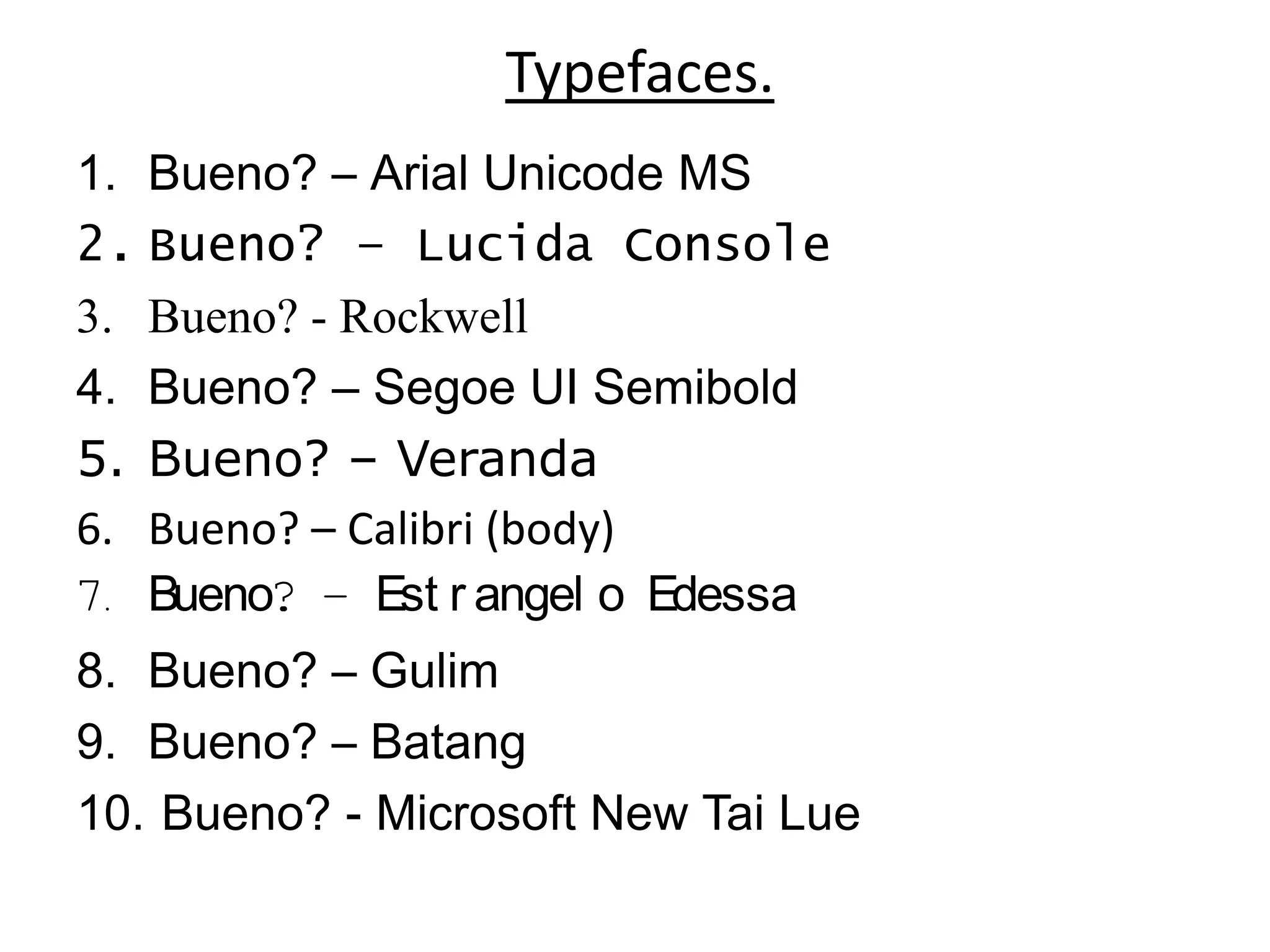 This document lists 10 different typefaces and fonts, asking "Bueno?" after each one to inquire about the quality or suitability of each typeface. It includes both common fonts like Arial, Calibri, and Verdana as well as some less common and non-English language fonts such as Rockwell, Gulim, Batang, and Microsoft New Tai Lue.