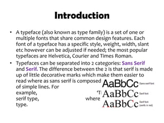 Typefaces are sets of fonts that share design features, and can be categorized as serif or sans serif. Typography has a history dating back thousands of years. Typefaces play an important role in films by helping set the genre through factors like movement, color, and positioning. For example, the black and white capital font used in the opening of the film "Face/Off" suits the creepy thriller setting and creates an eerie atmosphere. Choosing different fonts, sizes, and colors can significantly impact audience perception of a film's genre.