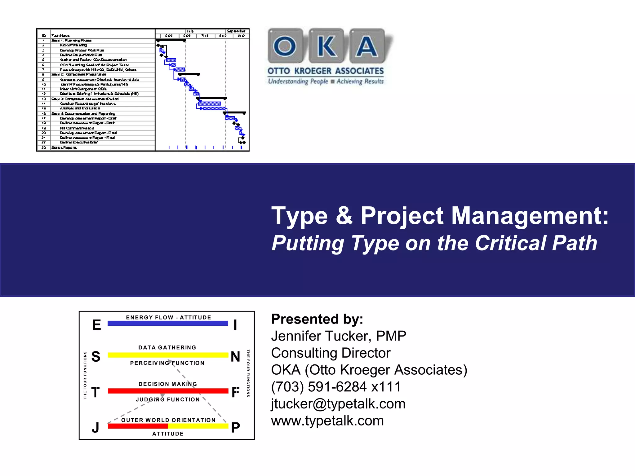 The document discusses the integration of psychological type into project management, highlighting key elements of the project life cycle, factors for success and failure, and how personality types can influence project dynamics. It presents various exercises aimed at enhancing team collaboration and communication by utilizing psychological type concepts. The document also includes practical case studies and reflection activities to apply type-related knowledge in project environments.