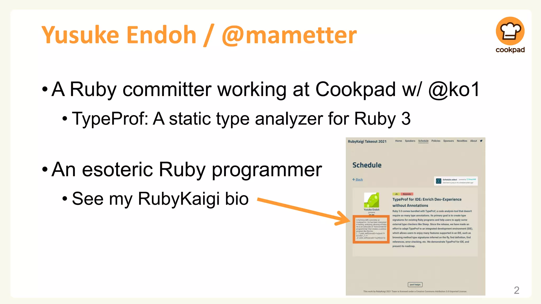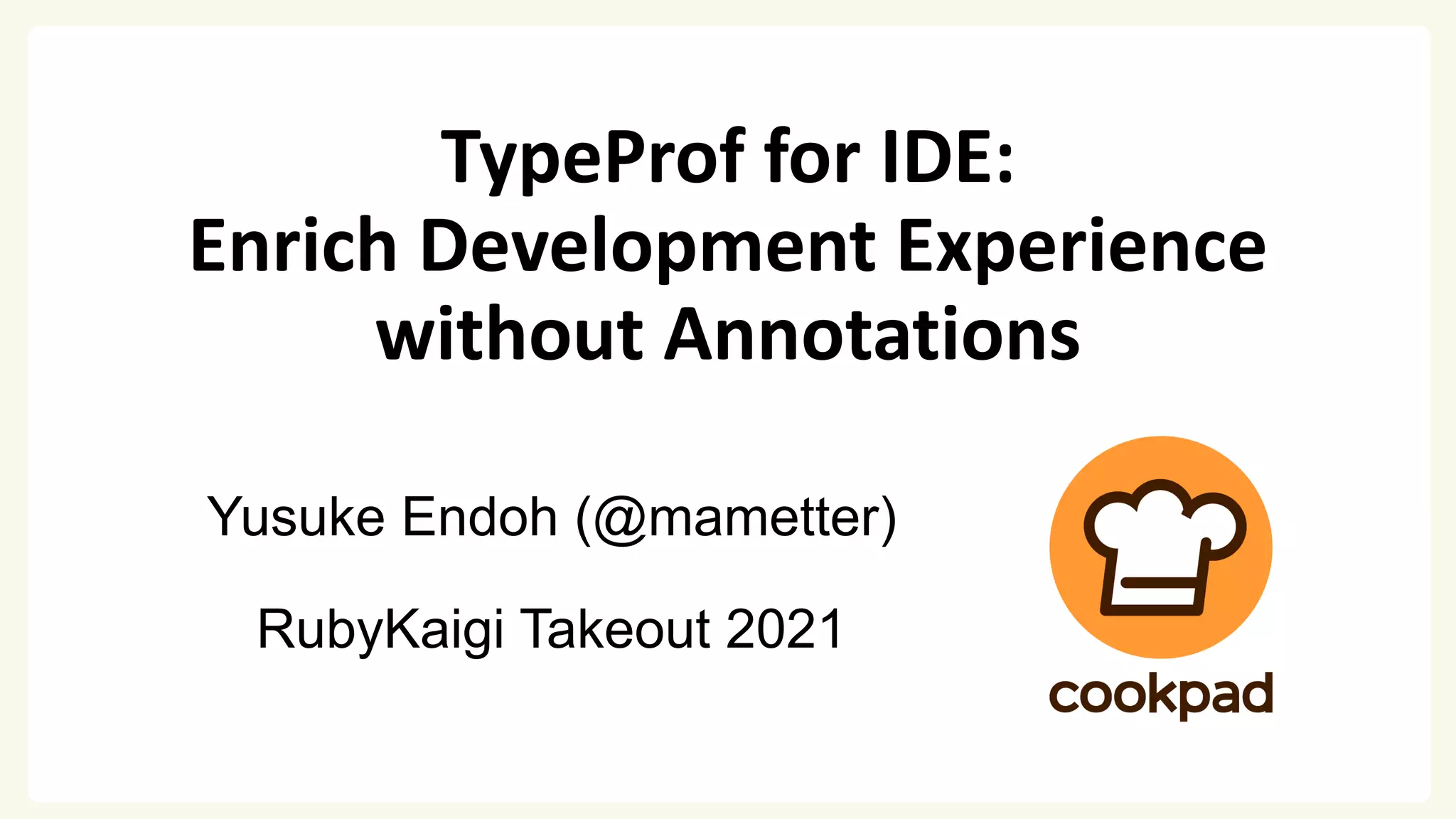 The document discusses TypeProf for IDE, a VSCode extension powered by TypeProf, a static type analyzer for Ruby. It allows achieving aspects of modern development experience like on-the-fly error reporting and type inference without type annotations. The demo shows features like method signature hints, error reporting, and completion working through the language server protocol. Future work includes improving parser robustness and optimizing analysis performance.