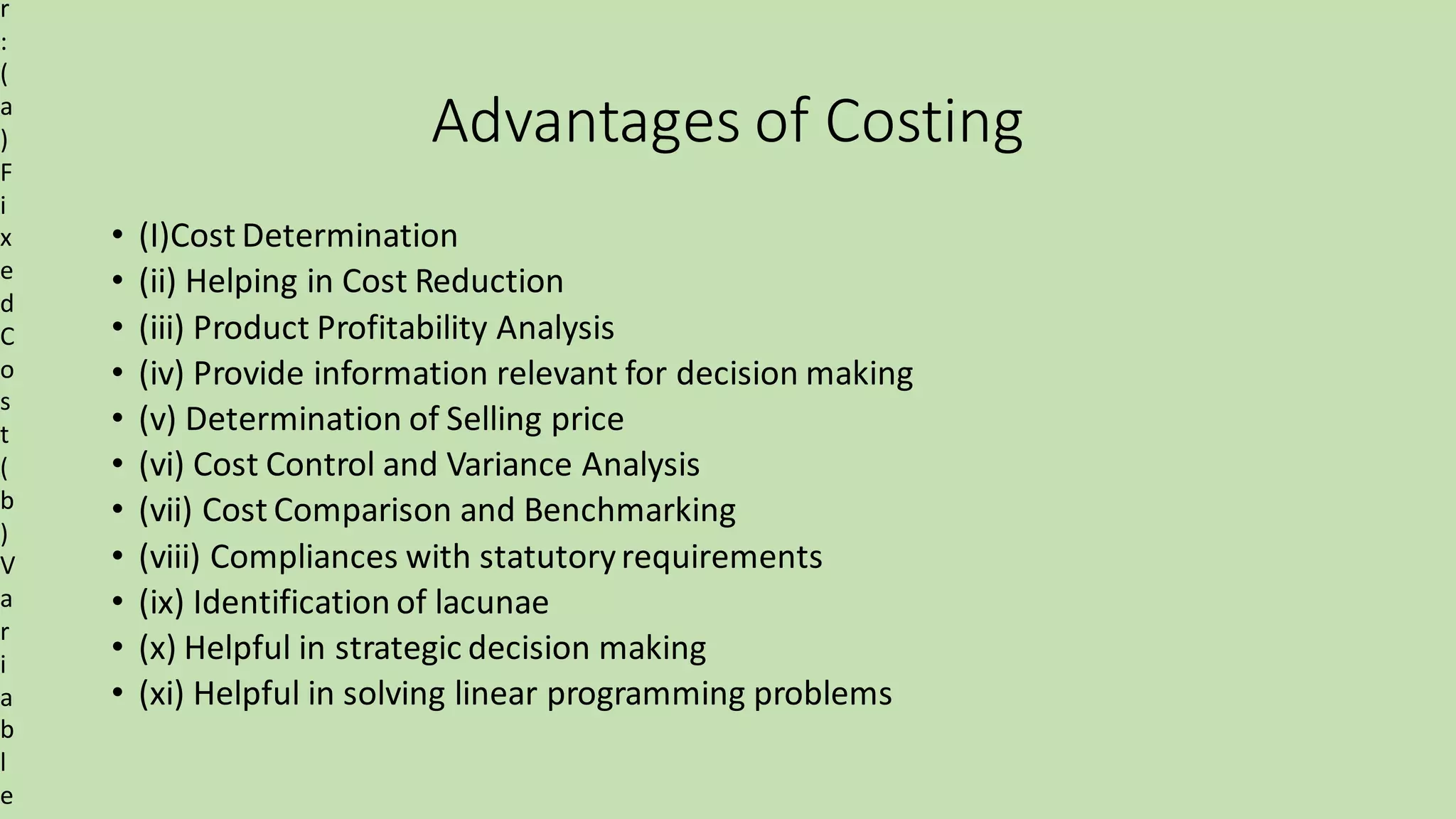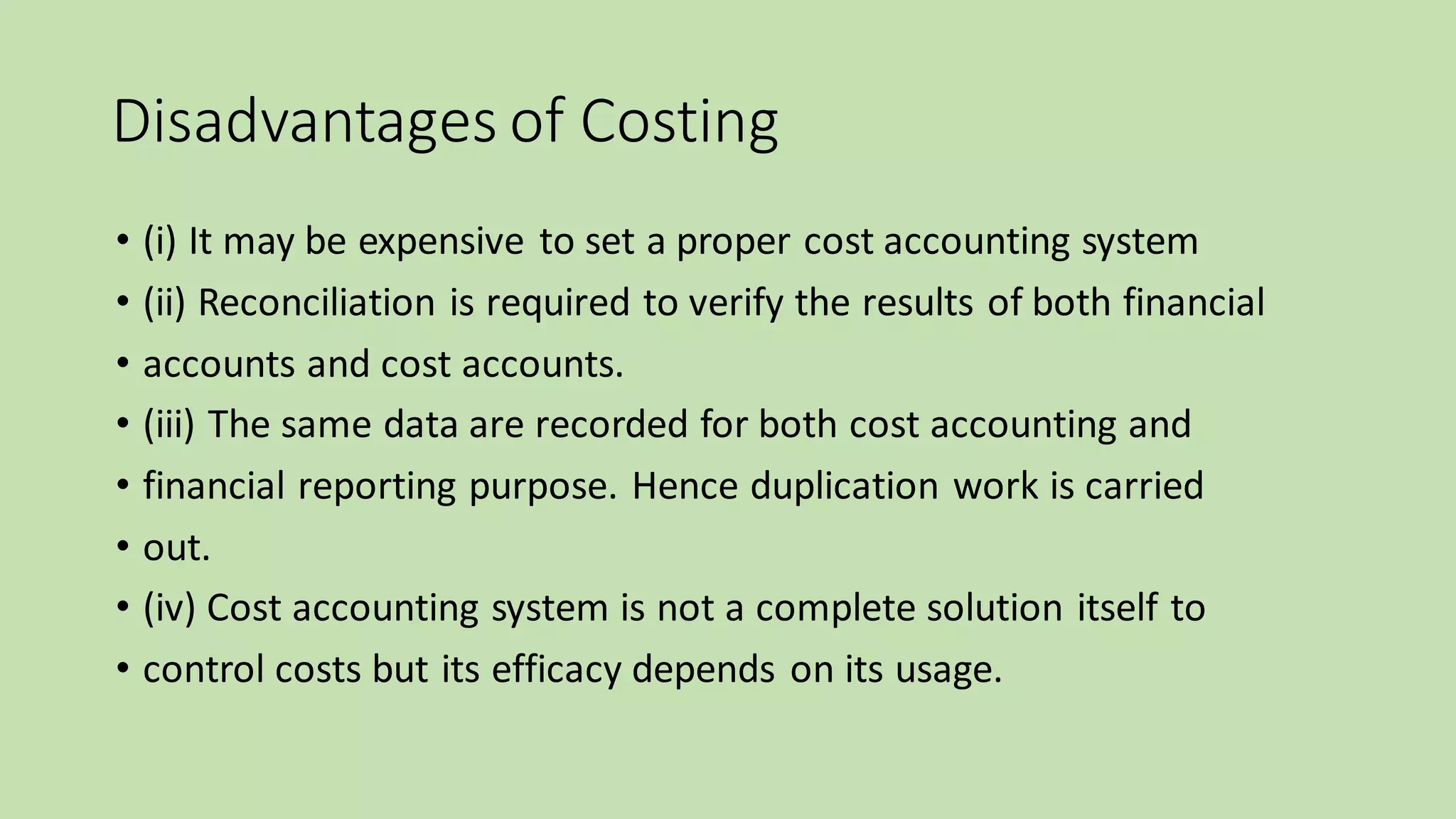 The document outlines several advantages and disadvantages of costing, classifications of costs, types of costs relevant for managerial decision making, methods of costing, and techniques of costing. The key advantages listed are cost determination, helping reduce costs, product profitability analysis, and providing information for decision making. The disadvantages include the expense of setting up an accounting system and potential duplication of recording costs. Costs are classified by nature, function, behavior, controllability, normality, and for decision making. Methods include job, process, batch, contract, and single/output costing. Techniques include uniform, marginal, standard/variance, historical, direct, and absorption costing.