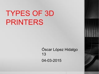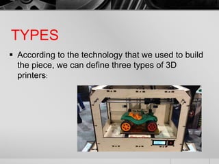There are three main types of 3D printers: photopolymerization printers which solidify liquid resin using light or lasers layer by layer; SLS or laser printers which use a laser to melt and solidify powdered raw materials layer by layer; and extrusion printers, which are the most common, that heat and extrude plastic filament in layers.