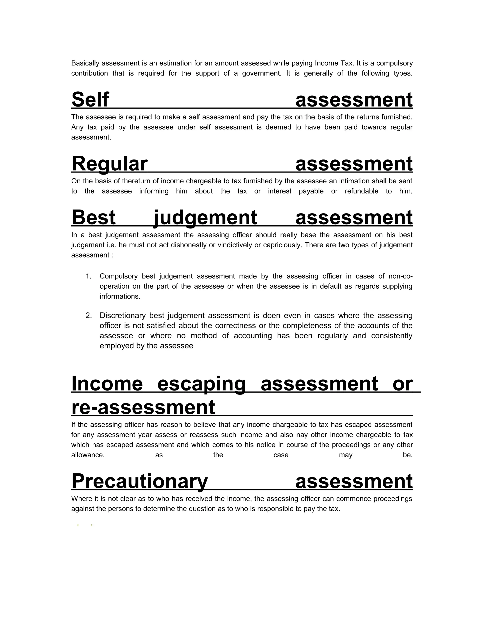 There are several types of assessments for income tax: self-assessment, where taxpayers pay taxes based on their own returns; regular assessment, where the tax authority informs taxpayers of taxes owed based on their returns; best judgement assessment, where the tax authority estimates taxes owed if a taxpayer's return is incomplete or inaccurate; income escaping assessment, where the tax authority assesses previously unreported income; and precautionary assessment, where the tax authority determines responsibility for tax when it is unclear who received the income.