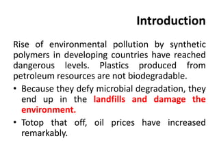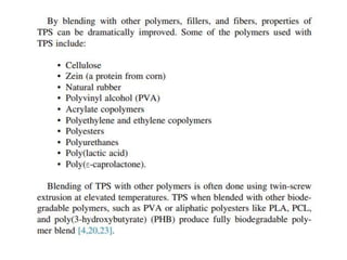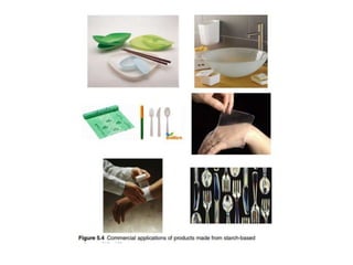 This document discusses types of biodegradable polymers. It begins by introducing the problems caused by non-biodegradable plastics and describes how biodegradable polymers are classified. There are three main ways to produce bio-based polymers: using modified natural polymers, producing monomers through fermentation then polymerization, and direct bacterial production. Bio-based polymers are divided into starch-based and cellulose-based. Starch-based polymers include thermoplastic starch, starch-synthetic polyester blends, starch-PBS/PBSA blends, and starch-PVOH blends. These starch-based polymers are used in applications where composting is effective and have properties suitable for various uses.