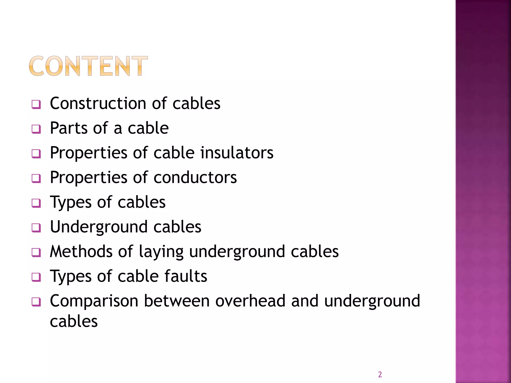 The document provides a comprehensive overview of various types of electrical cables, detailing their construction, components, and properties, as well as methods for laying and troubleshooting underground cables. It compares the advantages and disadvantages of aluminum and copper wiring, discusses different insulating materials, and explains fault types and testing methods. Additionally, it highlights the differences between overhead and underground systems regarding safety, cost, and maintenance.