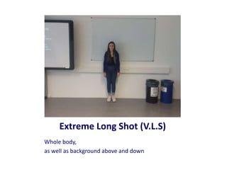 This document defines different types of camera shots used in media studies including extreme long shots, long shots, medium long shots, medium shots, medium close ups, close ups, and extreme close ups which show varying levels of detail from a whole body down to just eyes or fingers. It also discusses low angle, high angle, and Dutch angle shots and how they are used to convey meaning, status, and emotions through the camera positioning.