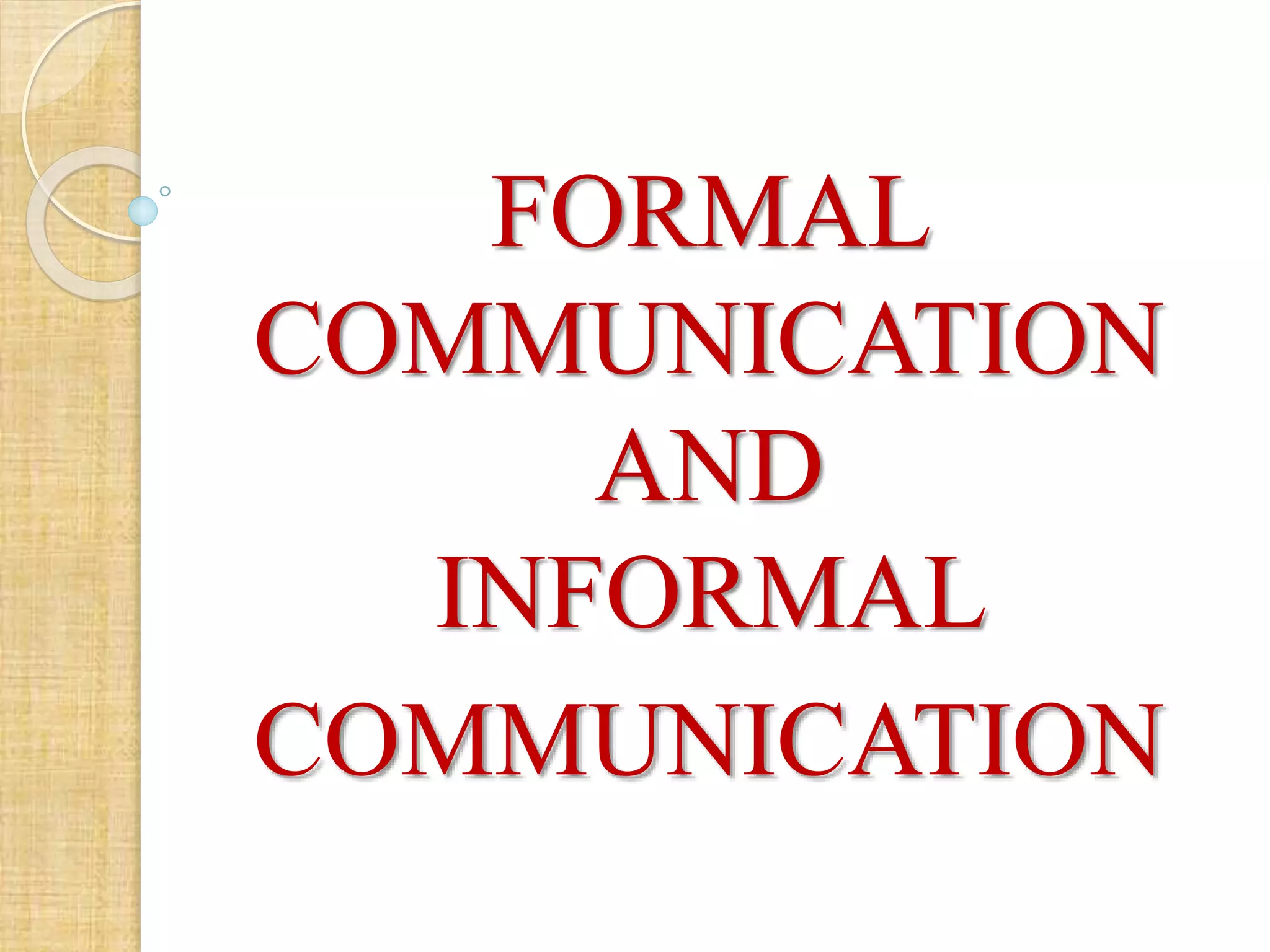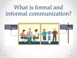 Formal communication refers to the transfer of information through official channels within an organization's chain of command, following rules and regulations. It maintains superior-subordinate relationships but can be time-consuming. Informal communication, also called the "grapevine", does not follow formal rules and can spread information randomly through personal networks faster but with less accuracy. While both have benefits, formal communication is necessary to achieve organizational goals and assign responsibility, while informal communication helps satisfy personal needs and reinforce relationships.