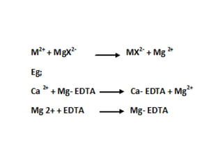 The document discusses different types of complexometric titration methods including direct titration, backtitration, replacement/substitution titration, and indirect titration. Direct titration involves directly titrating a metal ion solution with EDTA. Backtitration involves adding excess EDTA and back-titrating the excess with a second metal ion. Replacement/substitution titration involves quantitatively displacing one metal ion with the metal ion being determined. Indirect titration is used for anions by first precipitating them with a metal cation before titrating the metal with EDTA. The document also discusses titration curves in complexometric titration and EDTA as the most commonly used titrant.