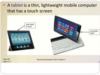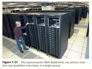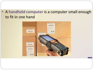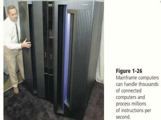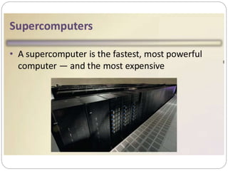 Computers are classified into three main types based on size and capacity: mainframe computers which are large and powerful used by many users at once in large organizations; minicomputers which are medium-sized used by many users at once in small organizations; and microcomputers or personal computers which are small and meant for individual use like desktops, laptops, and other mobile devices.