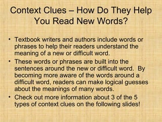 Context clues are hints in the text that help readers understand unfamiliar words based on the surrounding context. There are three main types of context clues: definition clues explicitly define the word, synonym clues use a word with a similar meaning, and antonym clues use an opposite word. Authors include these context clues so readers can logically infer the meaning of new words based on surrounding context without needing a dictionary. Mastering context clues improves reading comprehension.