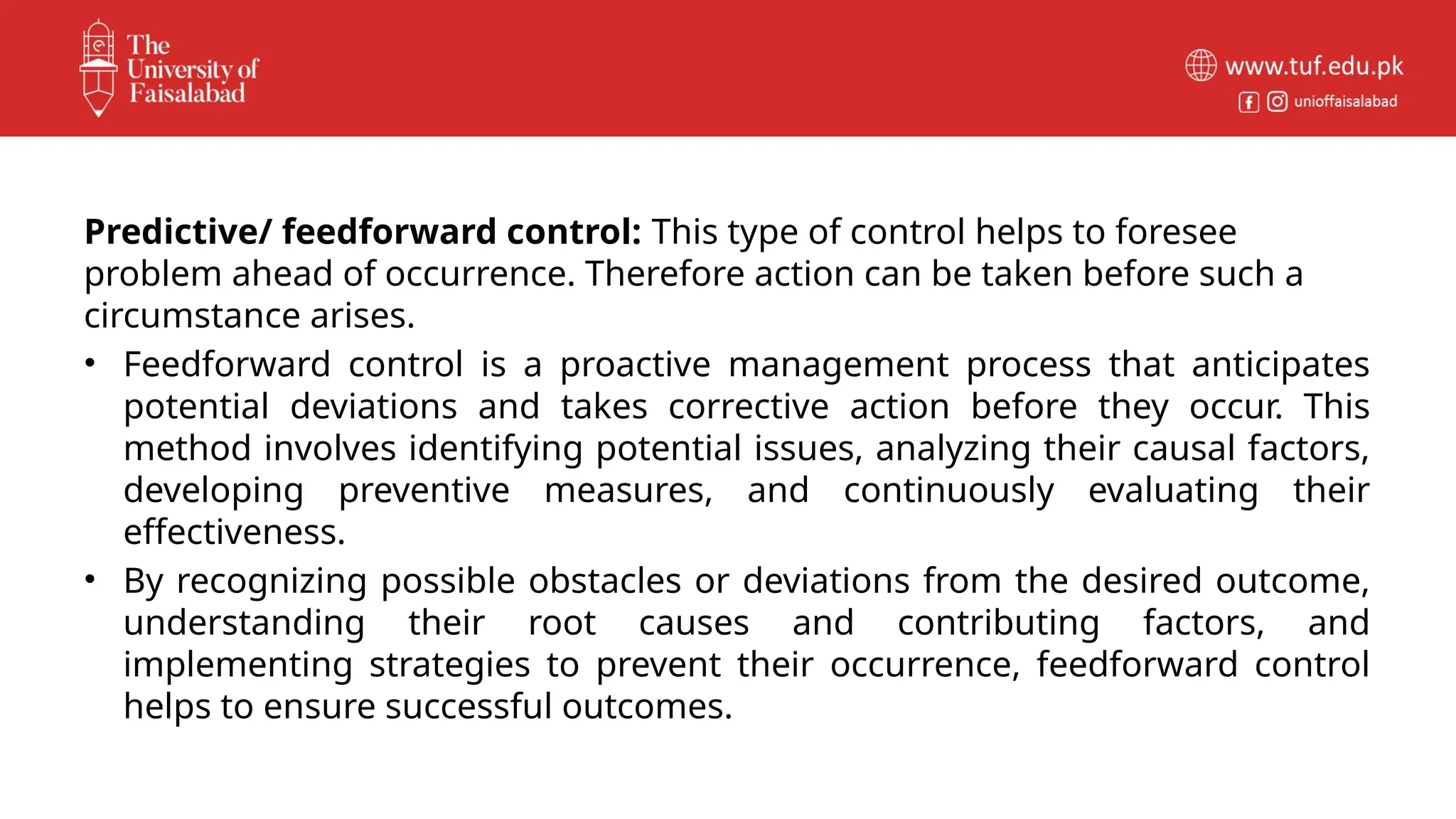 The document outlines three types of control: feedback control, concurrent control, and predictive/feedforward control. Predictive control anticipates and mitigates issues before they arise, while concurrent control focuses on real-time monitoring and immediate corrective actions. Feedback control evaluates completed tasks to improve future performance through assessments and adjustments.