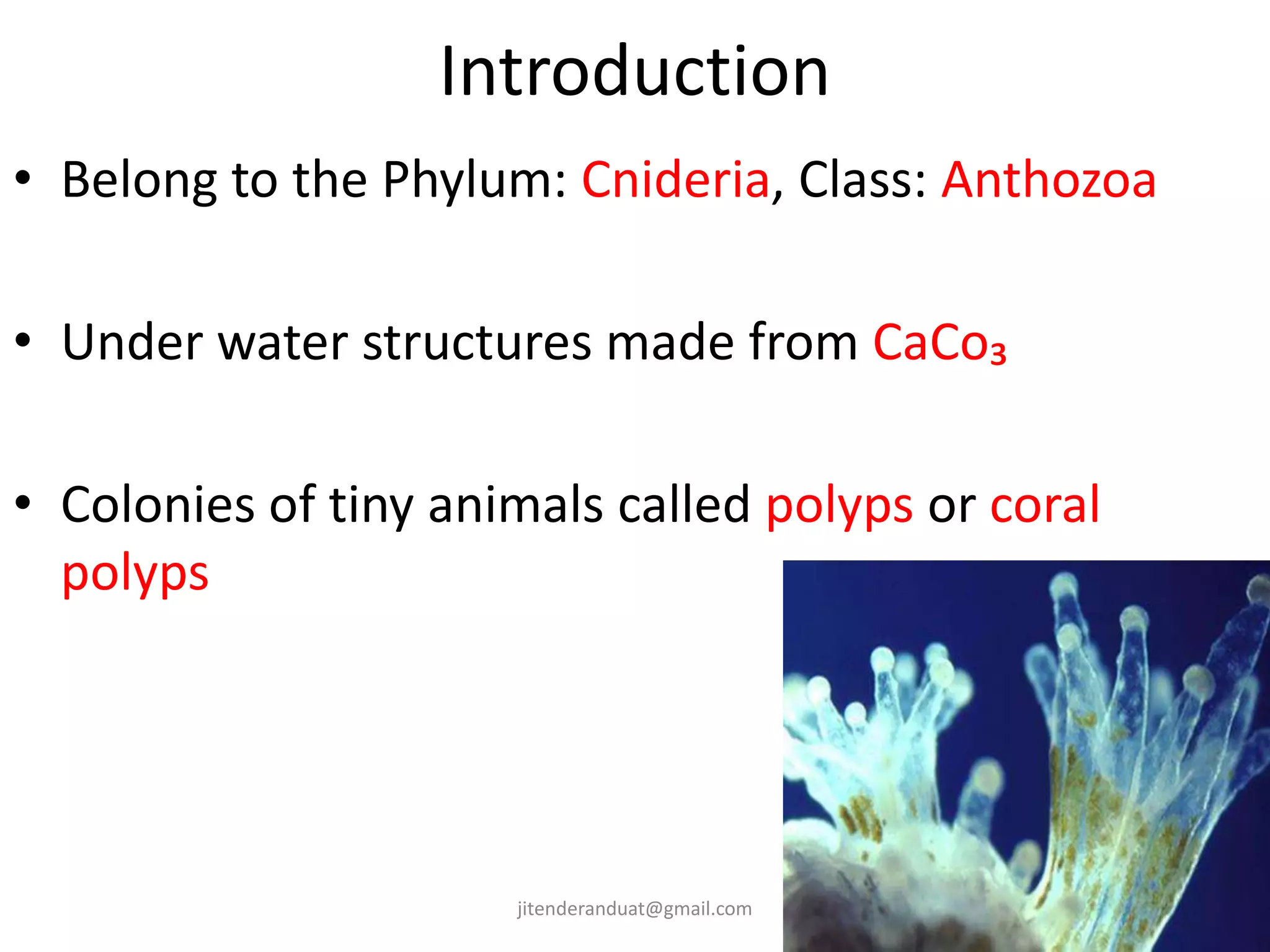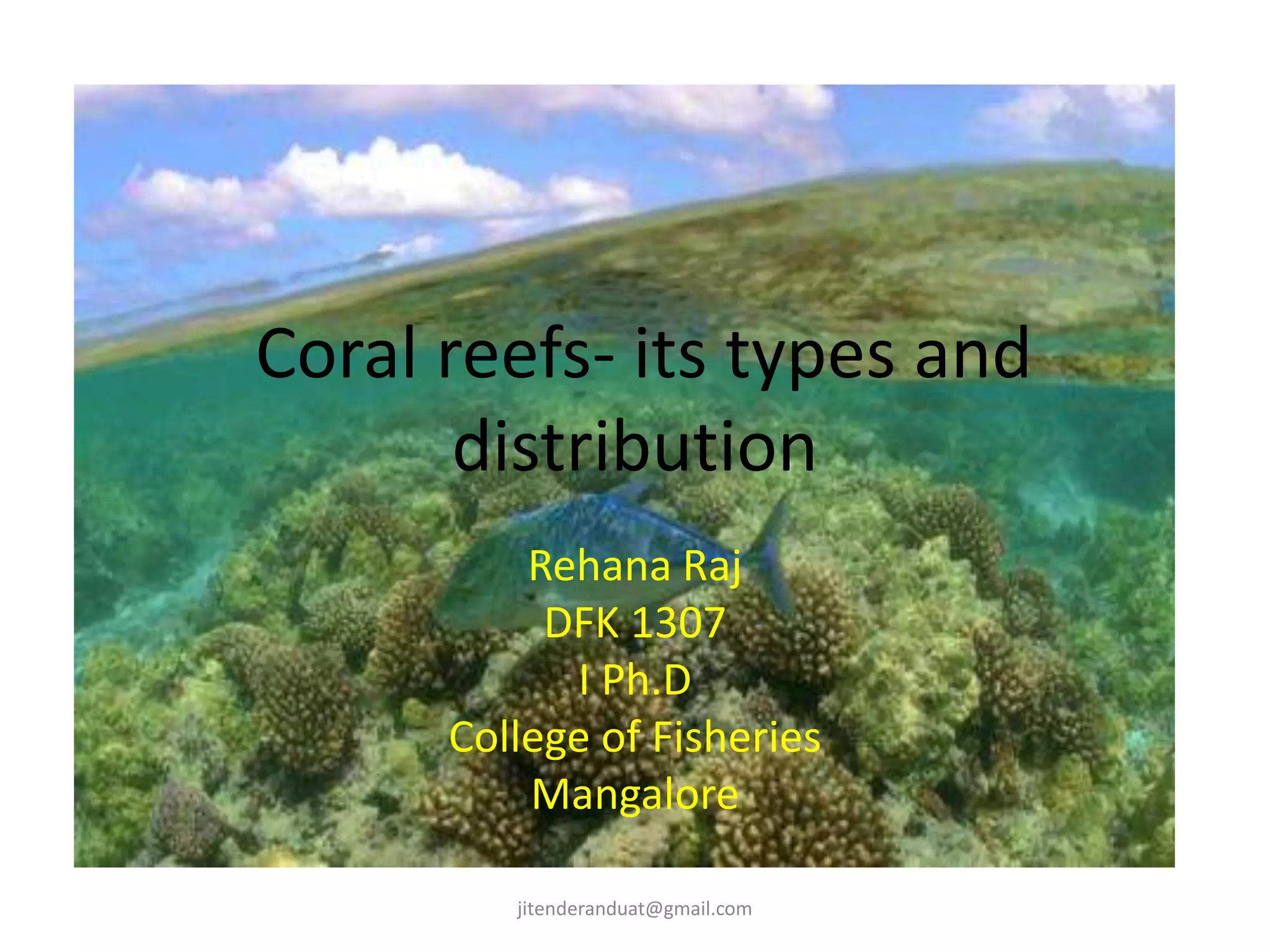 The document summarizes coral reefs, including their structure, types, distribution, and importance. It describes how coral reefs are formed by colonies of coral polyps that secrete calcium carbonate. There are various types of reefs defined by their location in relation to land, including fringing reefs, barrier reefs, and atolls. The largest concentrations are found in the Indo-Pacific region, Southeast Asia, and the Great Barrier Reef. Coral reefs are important ecosystems that provide coastal protection, support biodiversity, and have significant economic value through tourism and fisheries.