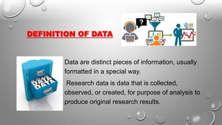 Data are distinct pieces of information collected for analysis to produce research results. There are two types of data: primary and secondary. Primary data is original data collected directly by the researcher through surveys, observation, or experimentation. Secondary data refers to data originally collected by someone else for another purpose that is now being used for a new study. Common methods for collecting primary data include observation, interviews, questionnaires, and schedules. Secondary data can come from government publications, journals, reports, and unpublished sources.