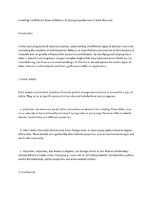 This document discusses the various types of defects in solid materials, including point, line, planar, and volume defects, and their significance on material properties and applications. Each defect type is explored in detail, highlighting how they impact characteristics such as strength, conductivity, and manufacturing processes. Understanding these defects is essential for advancements in materials science and technology.