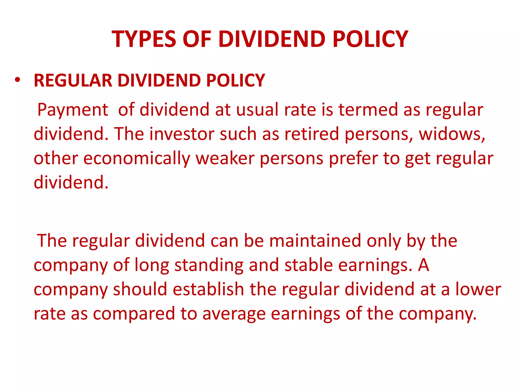 1. A regular dividend policy pays dividends at a usual rate and is preferred by retired investors who need steady income. It requires long-standing, stable earnings.