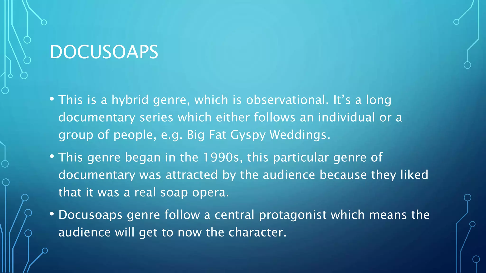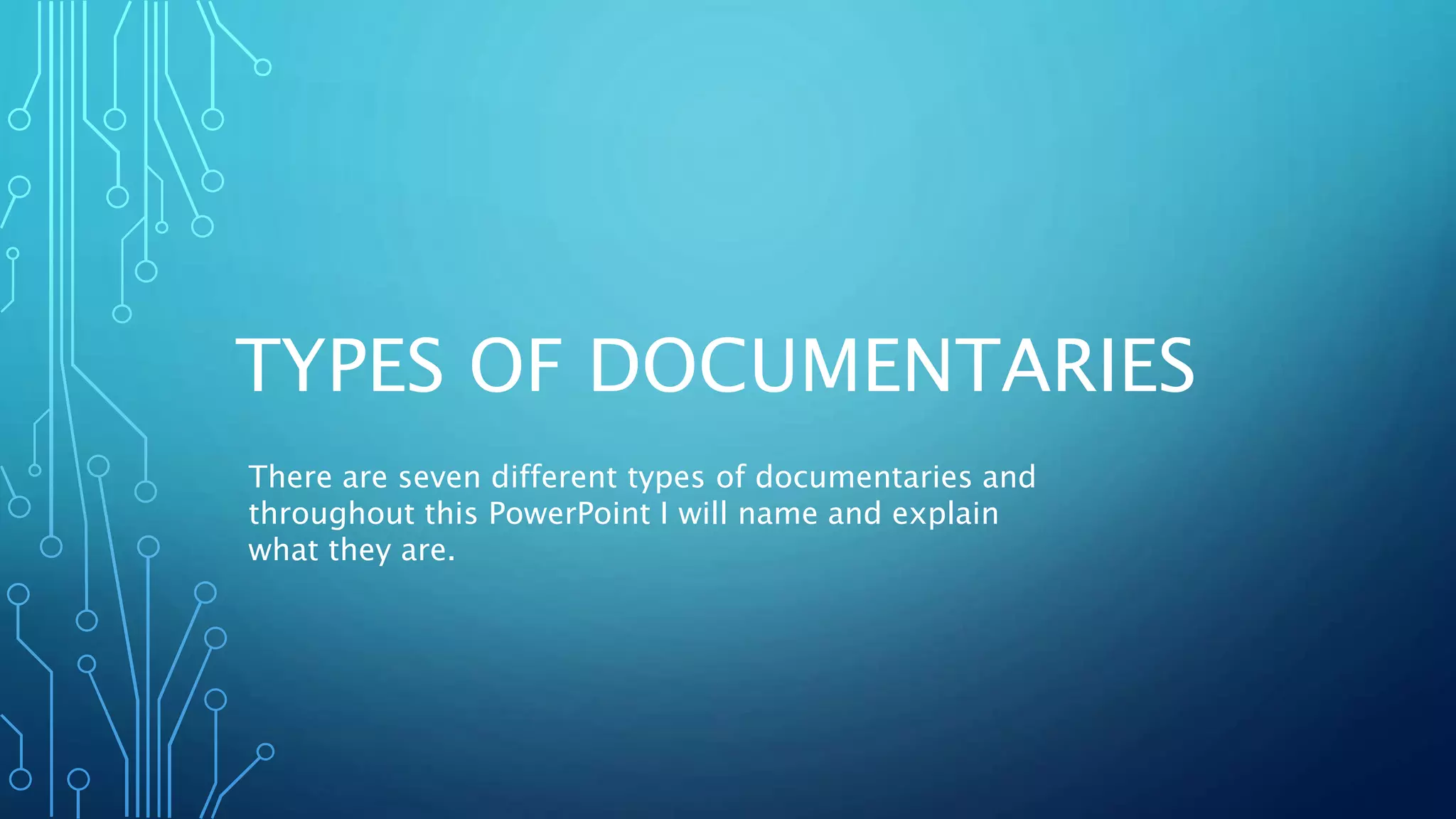 There are seven main types of documentaries: docusoaps, which follow individuals or groups in an observational style; reality TV, which blends information and entertainment; fly on the wall documentaries where cameras are unseen as they record events; mixed documentaries using interviews and footage; self-reflexive films where subjects interact with the camera; docudramas which reconstruct past events; and fully narrated films where a narrator speaks throughout.