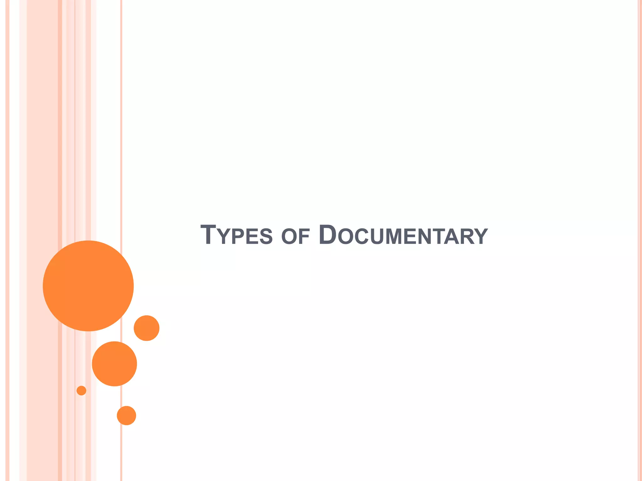 There are seven main types of documentaries: fly on the wall, docusoap, docudrama, reality TV, mixed, self reflective, and fully narrated. Fly on the wall documentaries have little to no narration and allow the audience to draw their own conclusions. Docusoaps follow individuals within a community in detail over time. Docudramas reconstruct events to portray atmospheres and feelings. Reality TV combines information and entertainment. Mixed documentaries use interviews, observation, archive footage, and narration. Self reflective documentaries have subjects aware of being filmed who speak to the camera. Fully narrated documentaries rely on a narrator throughout to convey information and arguments.