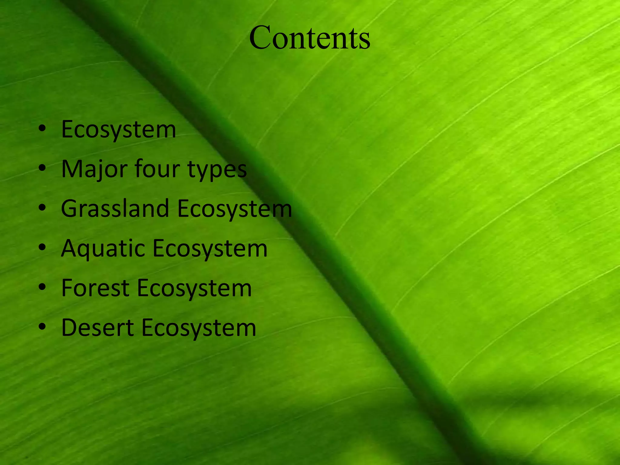 There are four major types of ecosystems: grassland, forest, aquatic, and desert. Each ecosystem is defined by its biotic and abiotic factors. Biotic factors include living organisms, while abiotic factors include non-living elements like air, soil, water, and sunlight. Ecosystems are classified based on these factors and provide important functions such as purifying water, recycling nutrients, and supporting biodiversity.