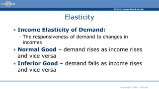 This document discusses different types of elasticity including income elasticity of demand, cross elasticity of demand, and price elasticity of supply. It provides examples and interpretations of different elasticity values. Income elasticity indicates how responsive demand is to changes in income. Cross elasticity measures the responsiveness of demand for one good to price changes of another good. Price elasticity of supply indicates how responsive the quantity supplied is to changes in price. Factors like time period and industry characteristics affect elasticity of supply. Elasticity is important for understanding the effects of taxes, production lags, and firm behavior.