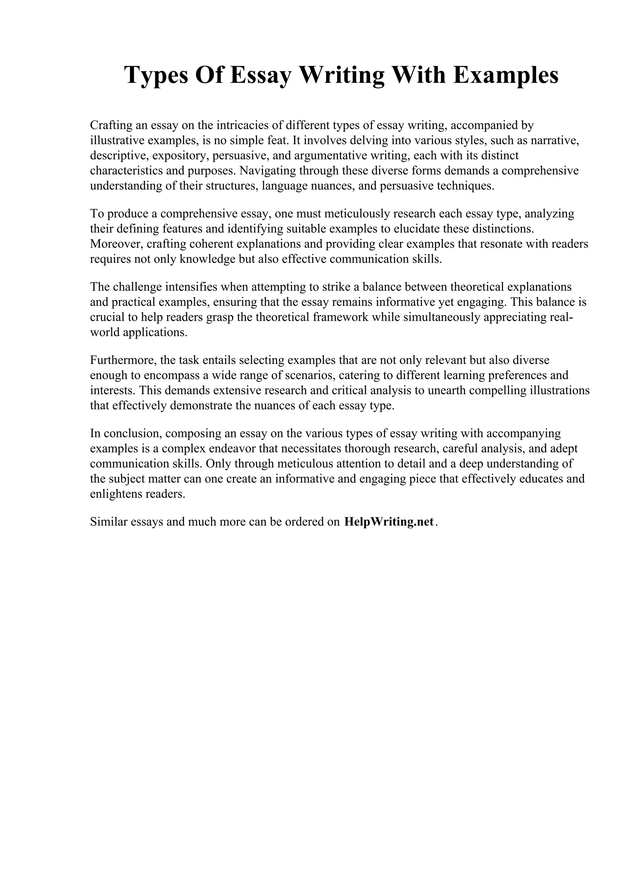The document discusses the challenges of writing an essay about different types of essays and providing examples of each. It notes that such an essay requires delving into various styles like narrative, descriptive, expository, and persuasive writing. It also must maintain a balance between theoretical explanations and practical examples to inform and engage readers. Additionally, the essay demands extensive research to find diverse, relevant examples that clearly demonstrate the nuances of each essay type. In conclusion, producing a comprehensive essay on types of writing with examples is a complex task requiring thorough research, analysis, and communication skills.