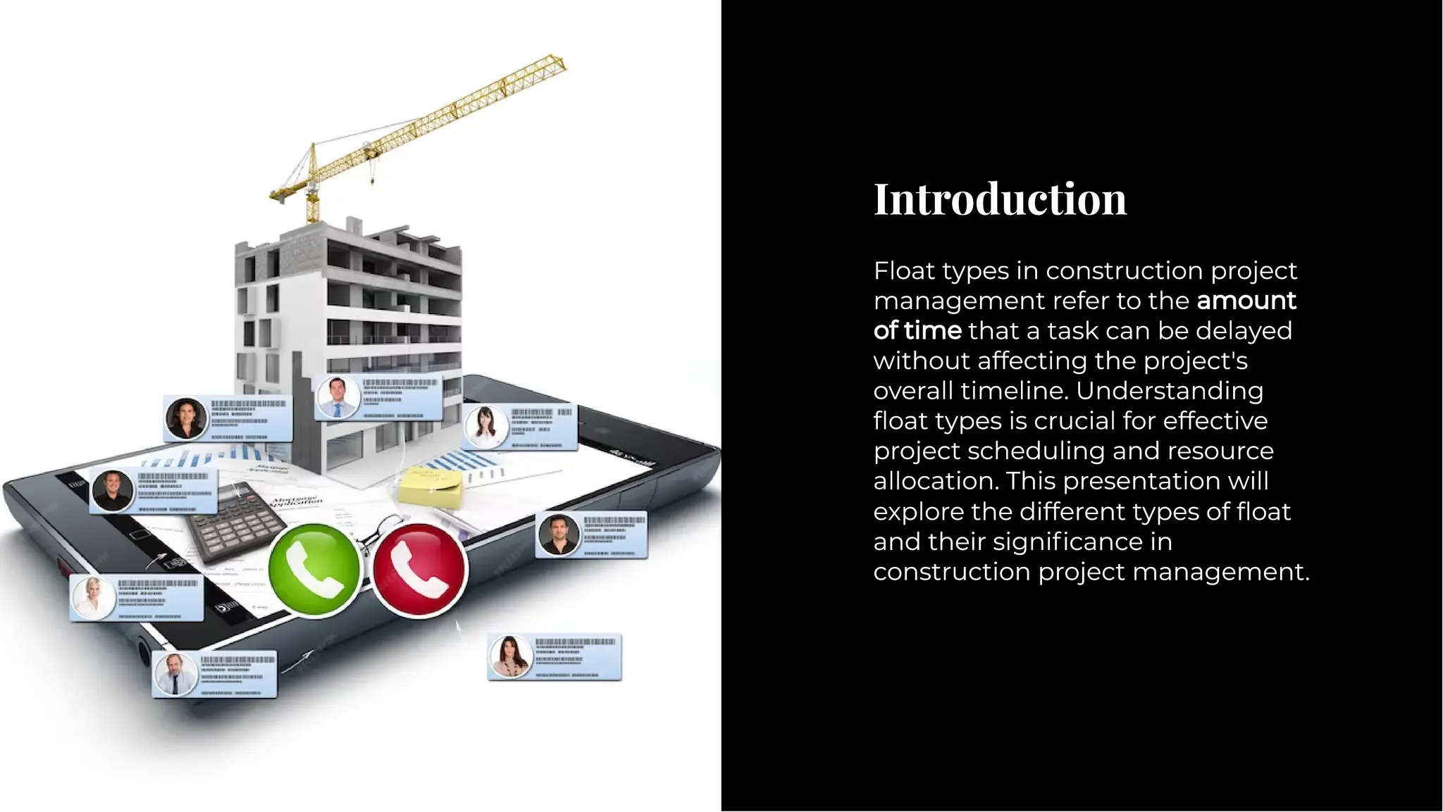 This presentation discusses different types of float that are important in construction project management. It defines total float, free float, and independent float, explaining how each provides insights into task flexibility and the ability to delay tasks without impacting the project's timeline. The presentation also describes the critical path as the sequence of tasks that determine the minimum time to complete the project, and stresses the importance of understanding float types and the critical path to optimize scheduling and resource allocation and ensure successful project delivery.