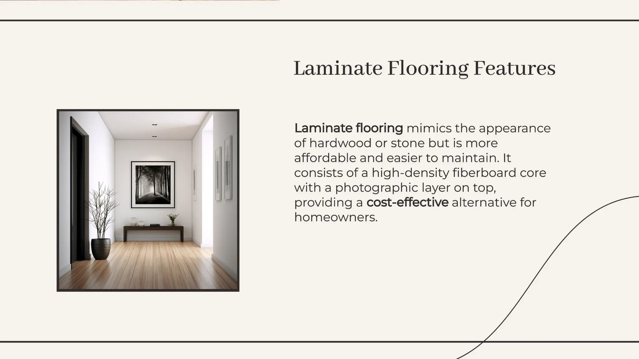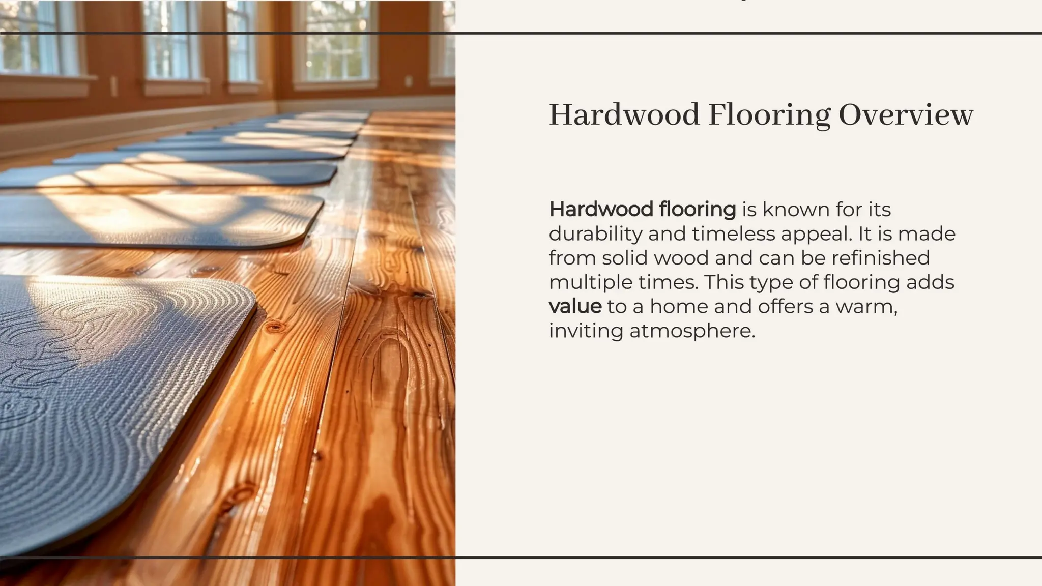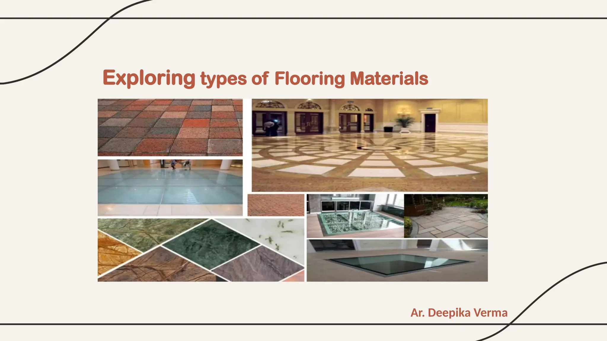 The document discusses various flooring materials, categorizing them into types such as carpet, wood, ceramic, and vinyl, and describing their suitability for different applications. Key materials include cement concrete, bricks, flagstones, marble, glass, plastic, and asphalt, each with specific properties and uses. Factors influencing the choice of flooring material include cost, durability, appearance, and insulation properties.