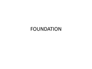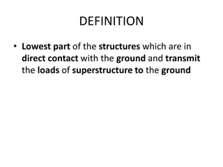 Foundations transmit loads from structures to the ground. Shallow foundations have depths less than their widths and include footings and rafts. Deep foundations have greater depths and include piles and caissons/wells. Footing types include isolated, wall, combined, cantilever, inverted arch, and raft. Piles can be end-bearing, friction, or composite. Requirements for good foundations include distributing loads over large soil areas without exceeding bearing capacity and minimizing settlement. Methods to improve soil bearing capacity include increasing depth, draining water, compacting, grouting, and chemical treatment.