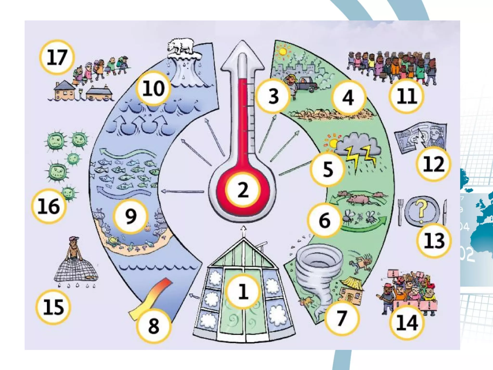 The document covers various types of graphs used to represent data, including bar graphs, line graphs, pie graphs, pictographs, and climographs. It explains the characteristics and appropriate uses for each graph type, highlighting how they can visually compare data and depict relationships. Additionally, it addresses the impact of climate change on health, suggesting a connection between climatic data representation and health outcomes.