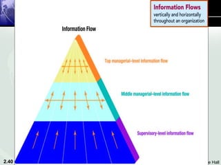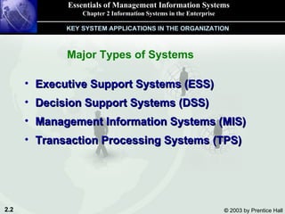 The document discusses different types of information systems used in organizations, including transaction processing systems, management information systems, decision support systems, executive support systems, and knowledge work systems. It describes how these systems integrate functions and business processes across departments like finance, human resources, manufacturing, and sales.
