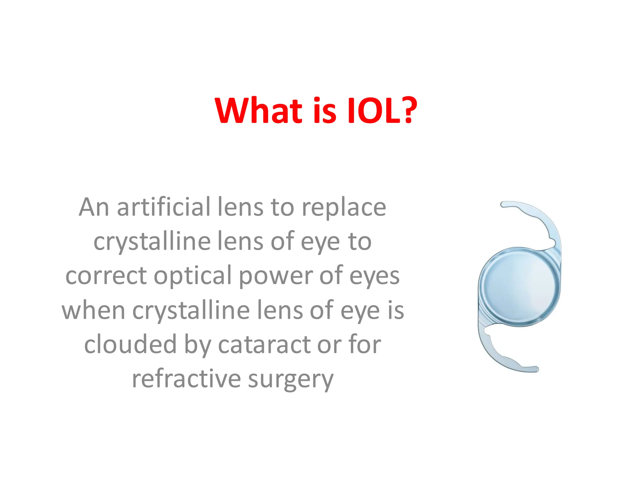 An intraocular lens (IOL) is an artificial lens used to replace the crystalline lens of the eye to correct vision, commonly used for cataract treatment. The document details the history, types, materials, designs, and advancements of IOLs, including multifocal and toric options, as well as their advantages and disadvantages. Over the decades, IOL technology has evolved significantly, improving visual outcomes and accommodating patient needs.