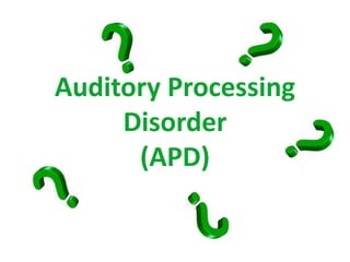 This document discusses several learning disorders: Auditory Processing Disorder (APD), also known as Central Auditory Processing Disorder, which affects how the brain processes and understands auditory information; Dyscalculia, which involves difficulties with mathematical concepts and operations; Dysgraphia, which impacts written expression; Dyslexia, characterized by problems with reading; and Dyspraxia, a disorder involving motor control and coordination. For each, it outlines common signs and symptoms and provides strategies to help students who have these disorders.
