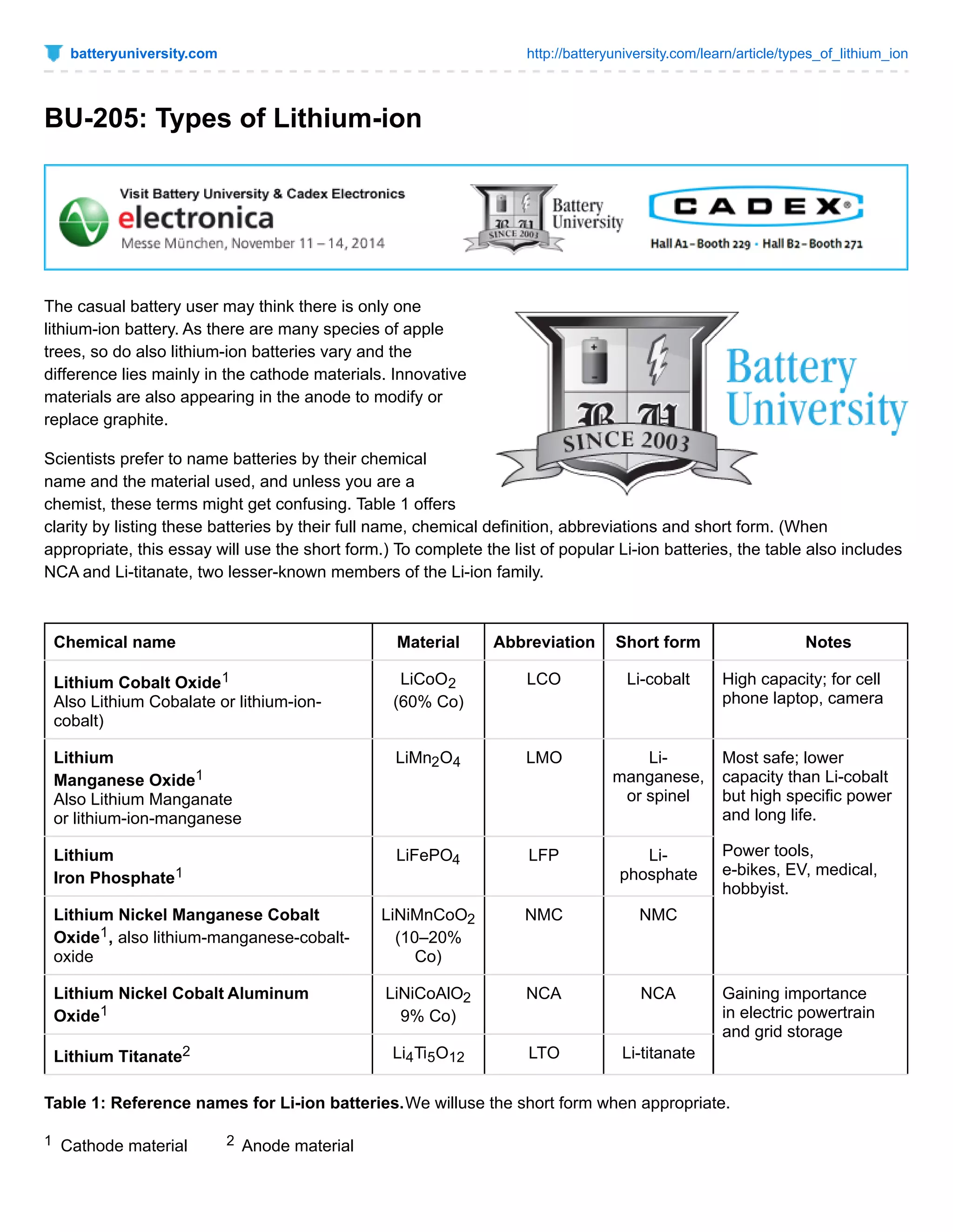 The document discusses different types of lithium-ion batteries that vary in their cathode materials. It provides the chemical names, abbreviations, and characteristics of six common lithium-ion batteries: lithium cobalt oxide (LiCoO2), lithium manganese oxide (LiMn2O4), lithium iron phosphate (LiFePO4), lithium nickel manganese cobalt oxide (LiNiMnCoO2), lithium nickel cobalt aluminum oxide (LiNiCoAlO2), and lithium titanate (Li4Ti5O12). Each battery type has different strengths and weaknesses in terms of specific energy, specific power, safety, temperature performance, lifespan, and cost. Lithium cobalt