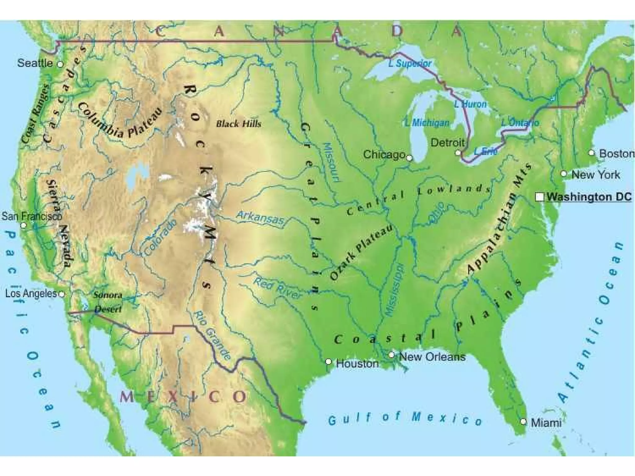 There are several types of maps that illustrate different information. Political maps show state and national boundaries as well as capital and major cities. Physical maps depict physical features like mountains, rivers, and lakes using colors to represent elevation. Resource maps indicate the natural resources or economic activities that dominate an area using symbols. Climate maps provide general climate and precipitation information using colors to represent zones. Topographic maps use contour lines to show land elevation and slope with closer lines indicating steeper slopes. Thematic maps focus on a specific subject like population, languages, or income through the use of data.