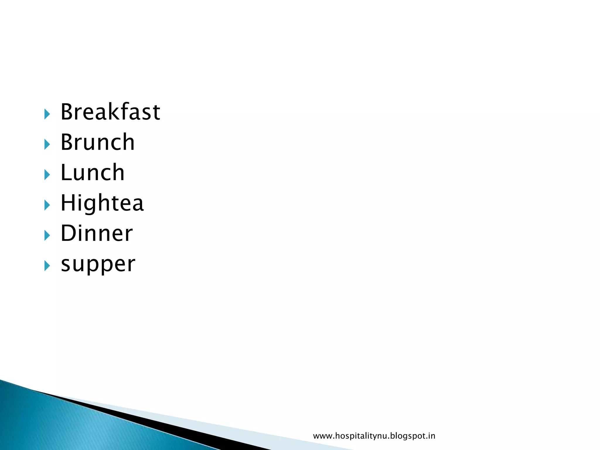 The document discusses different types of breakfast items and covers. It describes a continental breakfast as consisting of juices, breads like toast and pastries, and hot beverages like tea and coffee. It provides details on types of breads including brioche and different breakfast cereal options. The document also outlines the items that make up a full breakfast cover versus a continental breakfast cover.